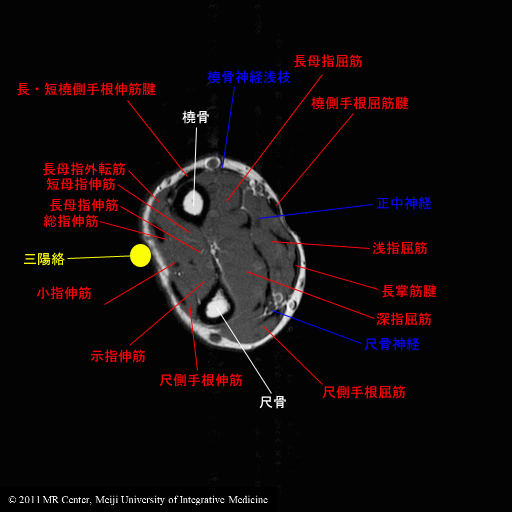 前腕後面、橈骨と尺骨の骨間の中点、手関節背側横紋の上方4寸。